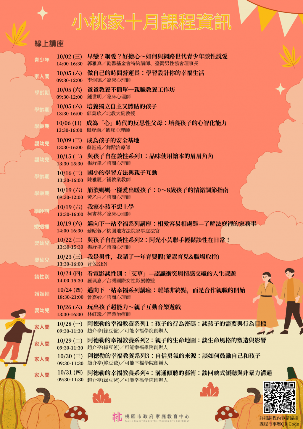 二、 | 旨揭課程詳細資訊,請見中心課程行事曆(https://reurl.cc/xlGyGL)或追蹤「桃園市政府家庭教育中心」FB粉絲專頁;另倘有家庭教育個別化服務需求,可撥打4128185諮詢專線或申請小桃家線上諮詢室(https://reurl.cc/oZWOY5)服務。 |