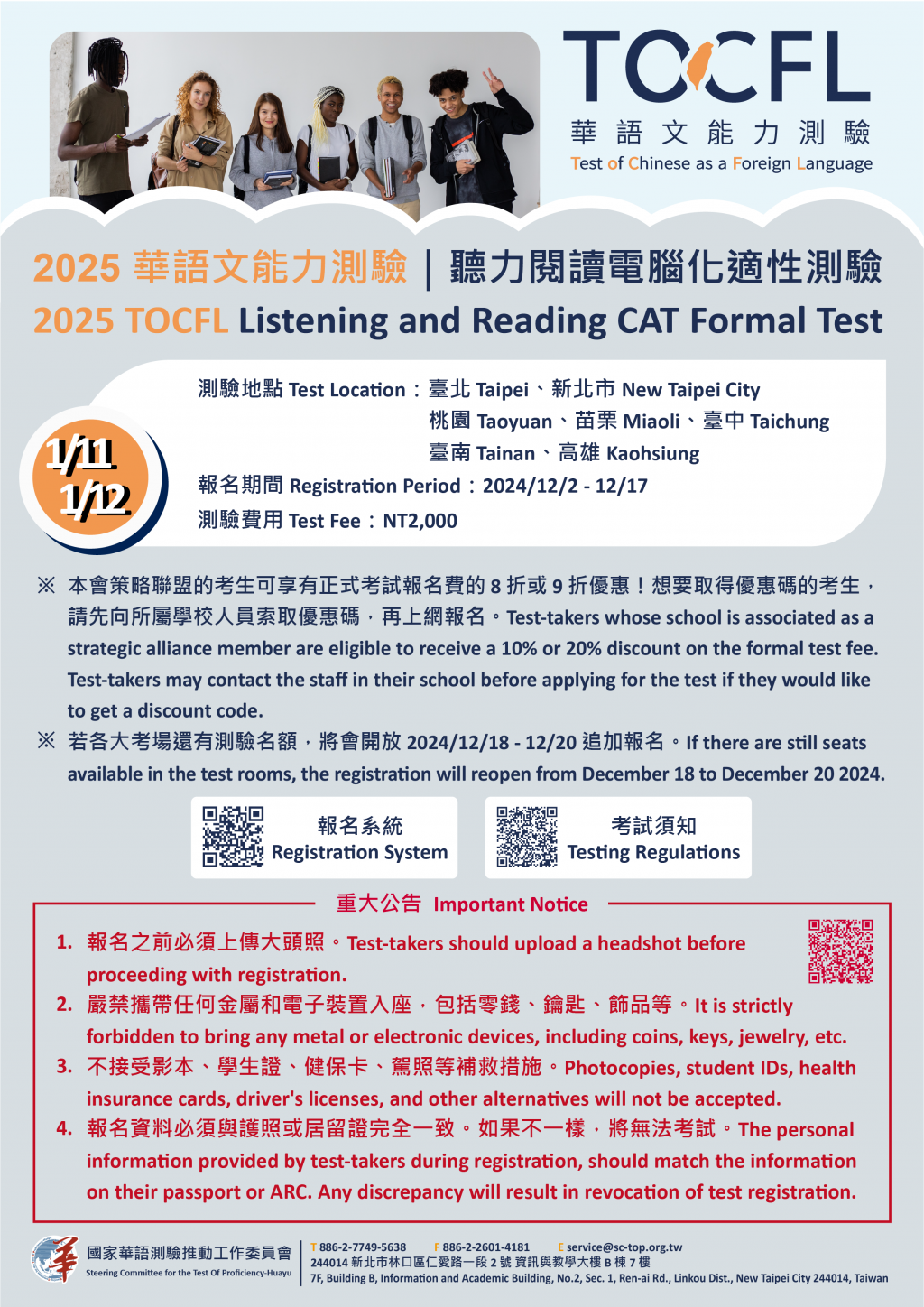 (二) | 114年11月12日(星期日):聽讀測驗-電腦化適性測驗、聽力測驗入門基礎級(移工留才久用方案)。 |