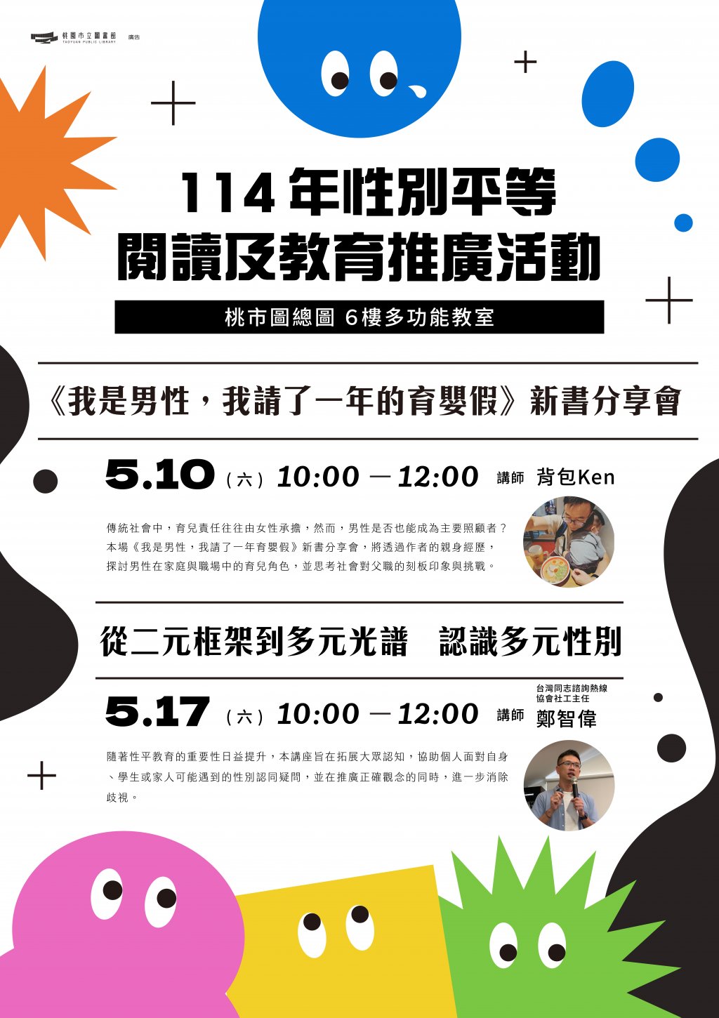 (一) | 114年5月10日(星期六)上午10時至12時辦理《我是男性,我請了一年育嬰假》新書分享會,將邀請本書作者-背包Ken,分享自身請育嬰假親身經歷,探討男性在家庭與職場中的育兒角色; |