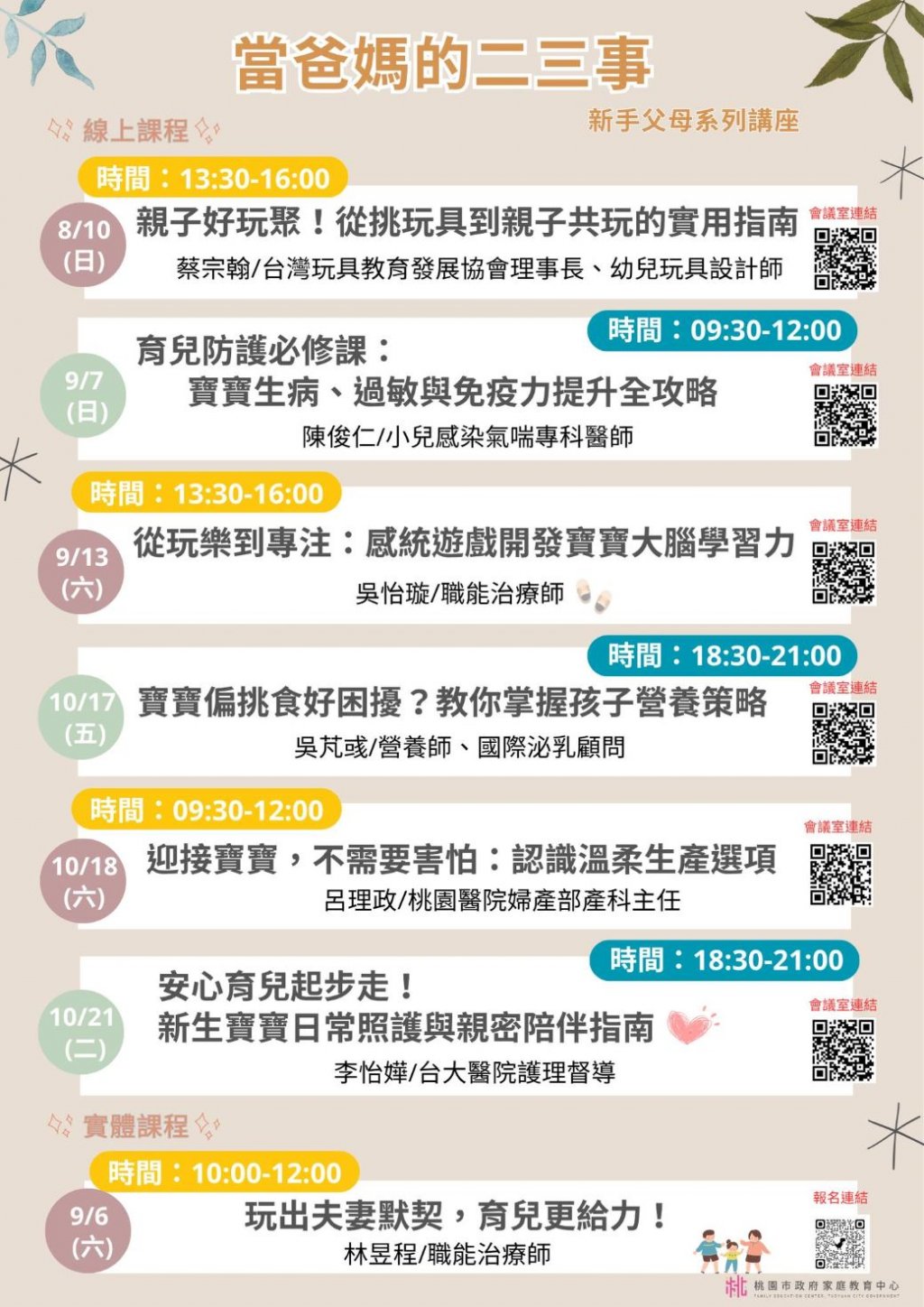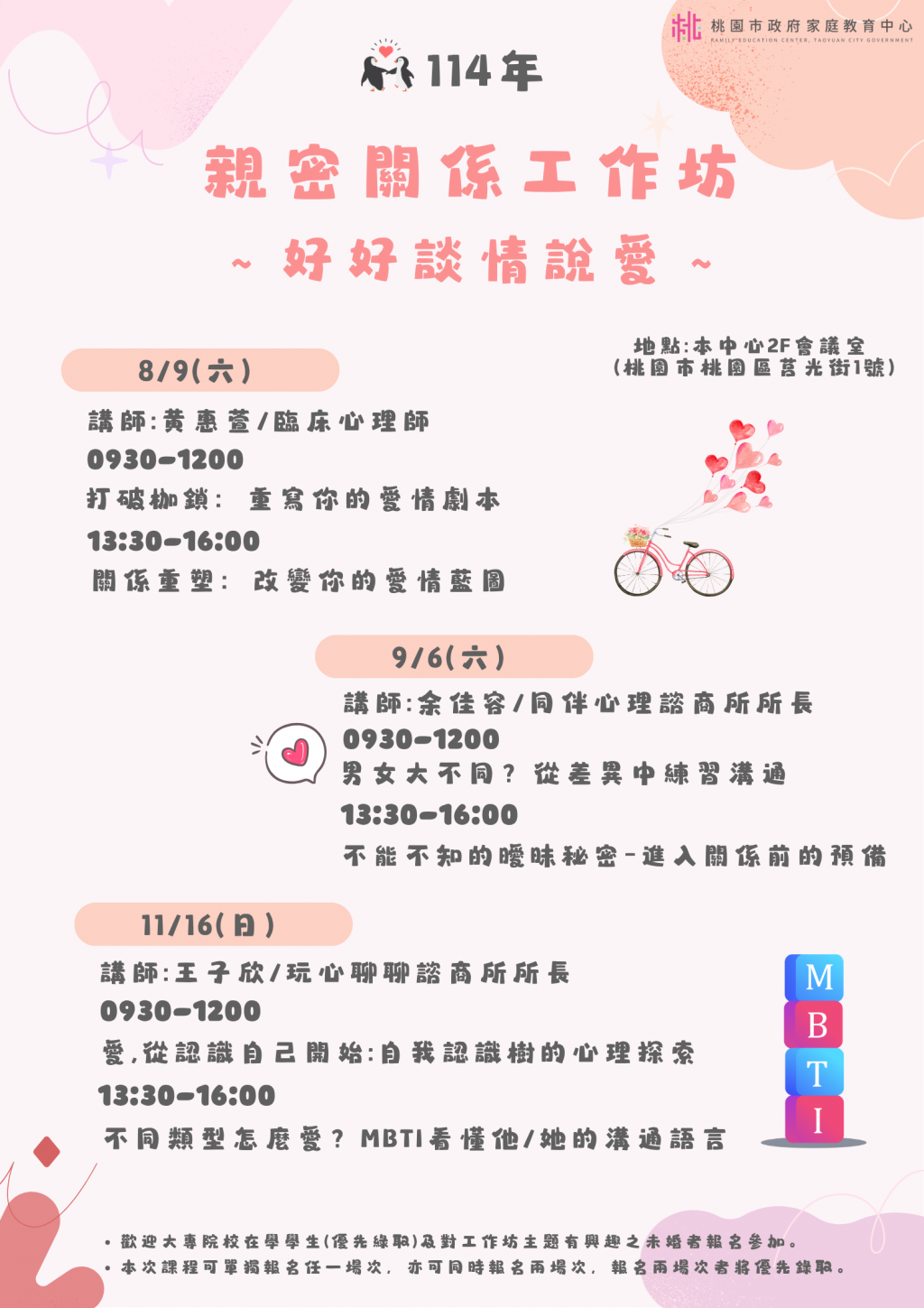 轉知家庭教育中心心「小桃家8月課程資訊」、「當爸媽的二三事」、「親密關係工作坊」
