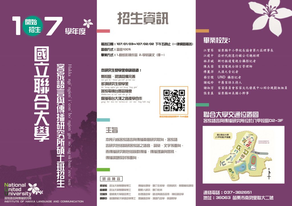 國立聯合大學客家語言與傳播研究所107年度碩士班招生訊息