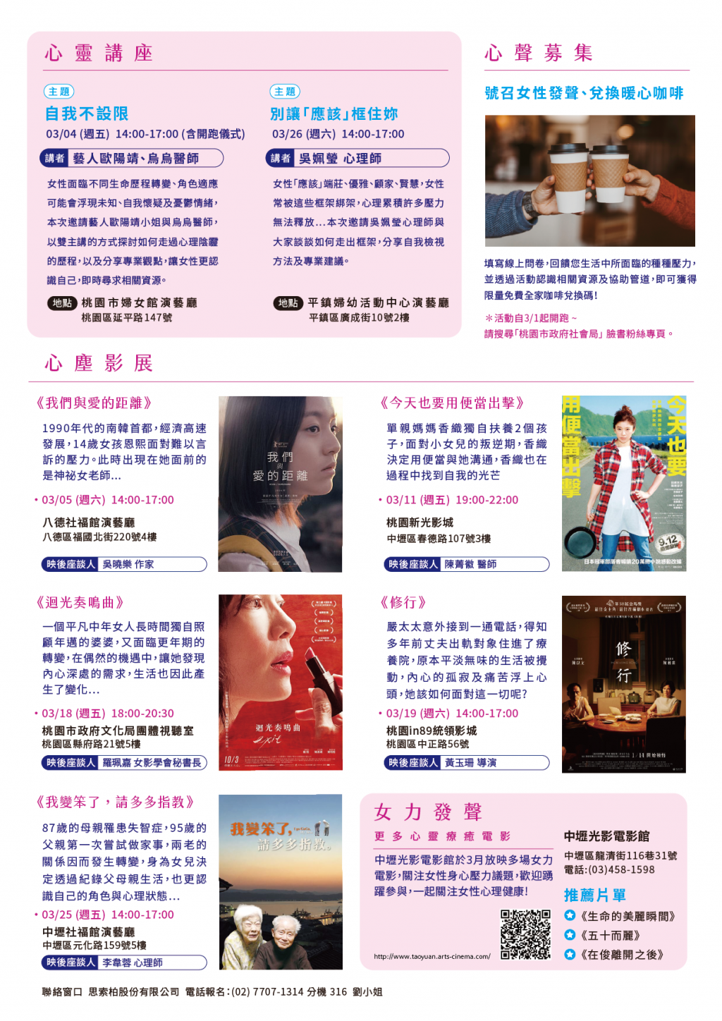 二、 | 近兩年受新冠肺炎疫情影響,國內外調查顯示女性較以往面臨更多的心理壓力,本市111年度婦女節系列活動以關注「女性心理健康」為主軸,透過「桃好妳心 三步驟 1看2聽3享受」辦理心靈講座、心塵影展及心聲募集活動,讓女性了解自身心理狀態,並進一步認識心理健康資源及協助管道。 |