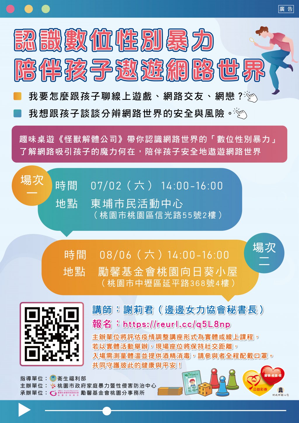 財團法人勵馨社會福利事業基金會(下稱該會)辦理「認識數位性別暴力─陪伴孩子遨遊網路世界」講座活動宣導海報1份