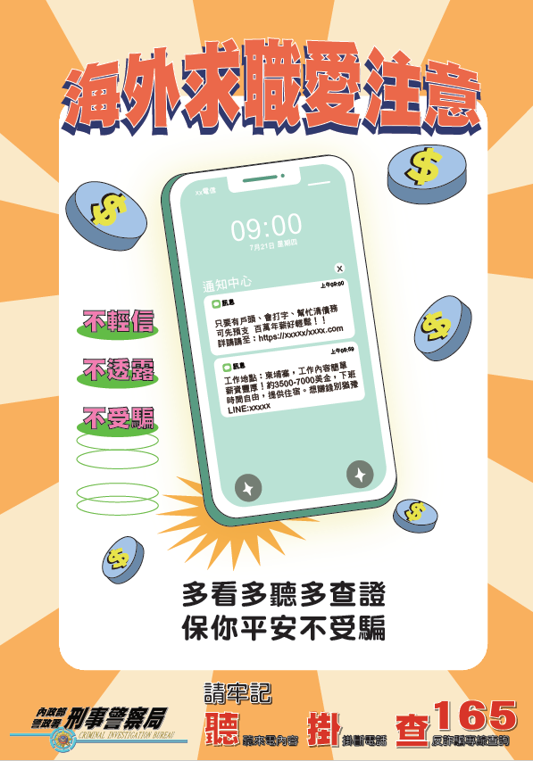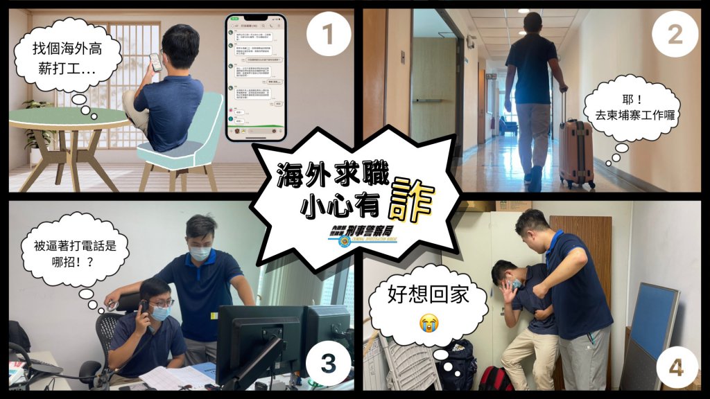 有關近期屢有國人被以「海外高薪打工」名義詐騙至國外,致財物受損並危及人身自由及安全等情事,為強化國人認知與警覺,內政部提供相關文宣資訊,透過多元宣傳管道向民眾宣導。