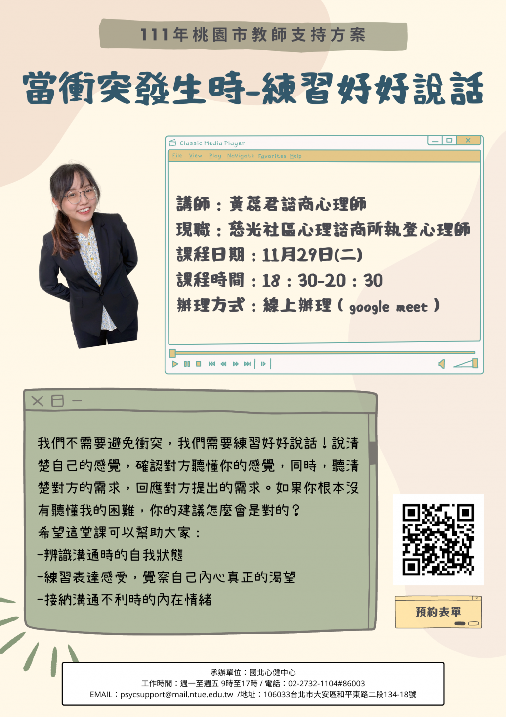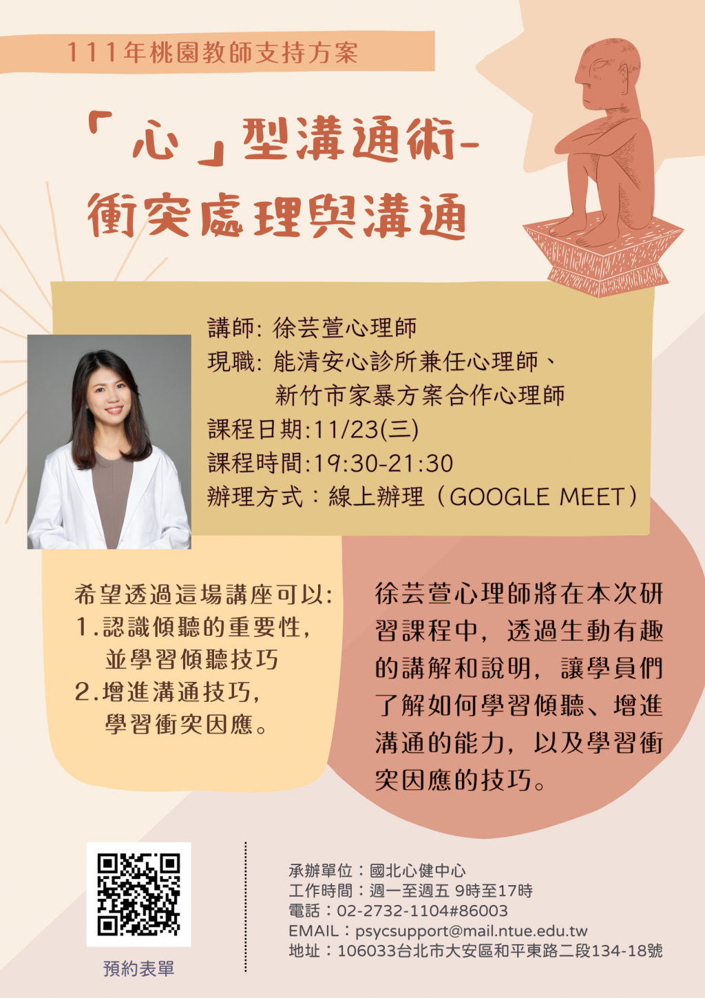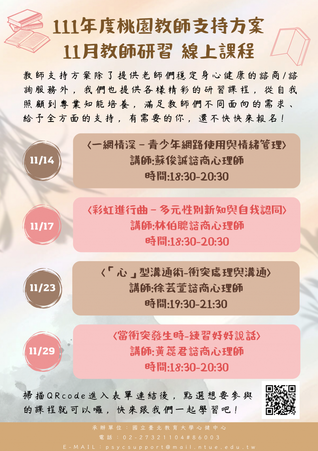 二、 | 為提供本市教師全面性的服務資源及促進自我覺察、情緒調節、衝突因應,以達身心健康之效,國立臺北教育大學(心理諮商暨健康促進研究中心)自111年11月14日至11月29日止,規劃4場教師研習的線上課程。請轉知所屬並請參考附件中的 QR Code 進行報名。 |