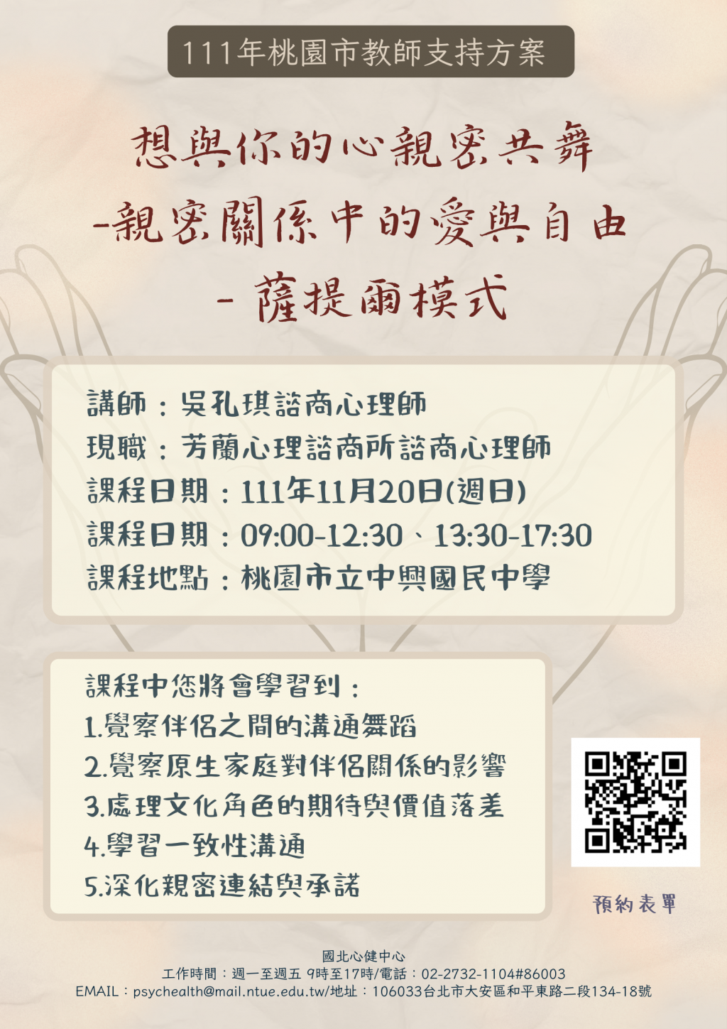 二、 | 為提供本市教師全面性的服務資源及促進教師與伴侶間的溝通、自我探索,國立臺北教育大學(心理諮商暨健康促進研究中心)規劃實體工作坊1場次。 |