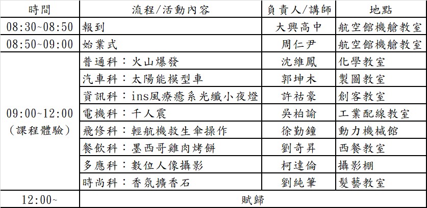 四、 | 主題與地點:活動全程免費,午餐自備(可代訂) (一)主題:當個創客人─「智慧」&「電競」工作坊。 地點:全程於南強工商。(二)主題:未來的旅行─智慧觀光與休閒。 地點:上午於南強工商,下午於德霖科大。 |