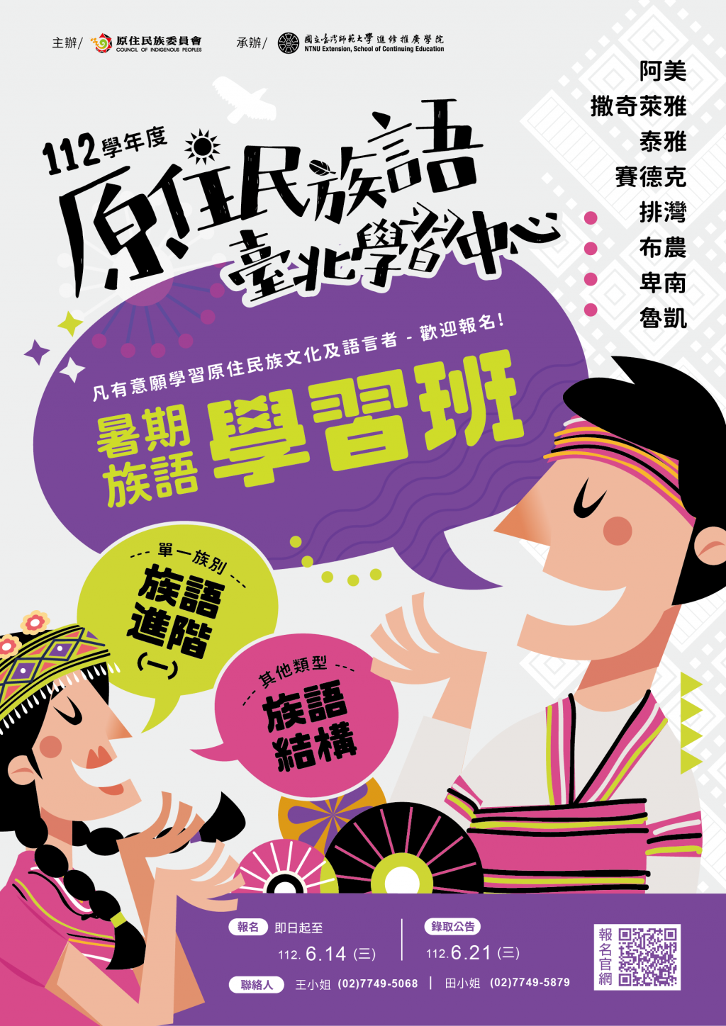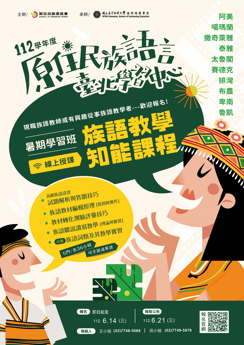 轉知國立臺灣師範大學辦理原住民族語言臺北學習中心112學年度暑期「族語學習班」及「教學知能課程學習班」課程資訊一案