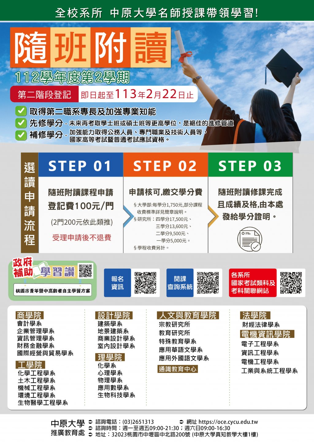 中原大學辦理「112學年度第2學期隨班附讀學分班」招生簡章